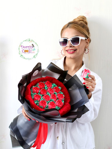 دسته گل خوراکی مارشمالو قرمز با کاغذ مشکی۲٬۴۰۰٬۰۰۰ تومان