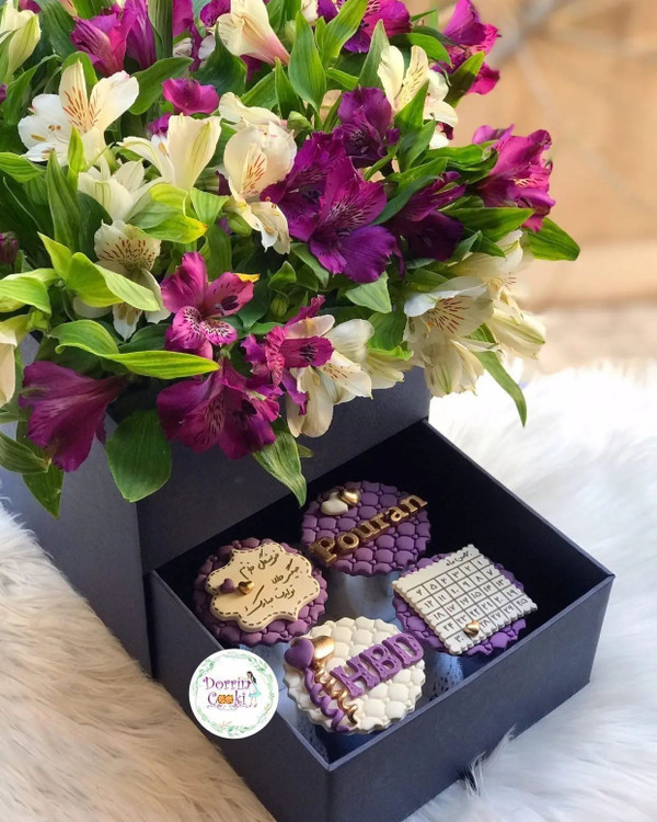 باکس گل دوطبقه سرمه ای همراه کاپ کیک تولد