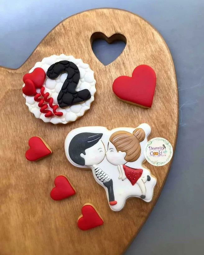 پک کوکی سالگرد ازدواج شامل ۲ عدد کوکی طرح سالگرد ازدواج و ۴ عدد قلب متوسط و ریز همراه جعبه و ربان