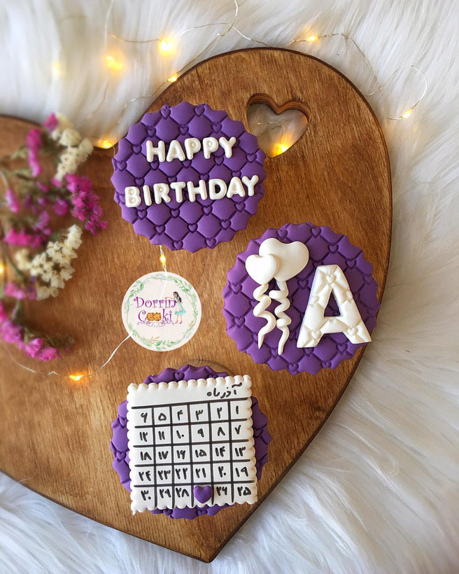 پک کوکی تولد بنفش و سفید شامل 3 عدد کوکی همراه جعبه و ربان