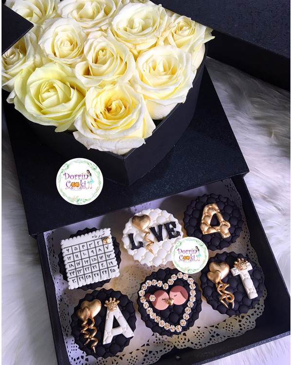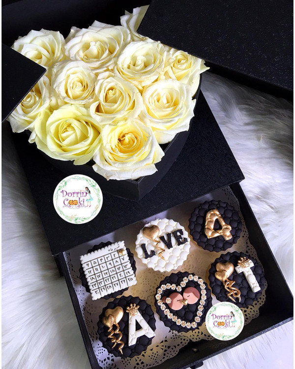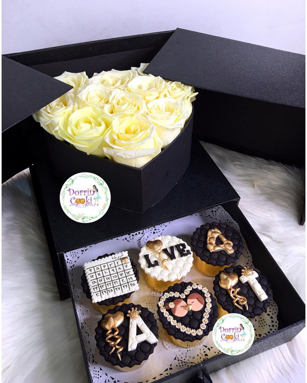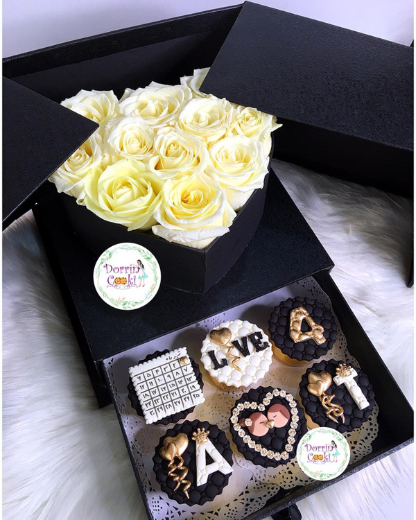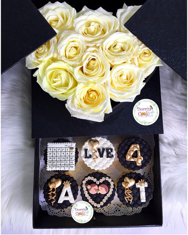 باکس سورپرایز لاکچری همراه کاپ کیک سالگرد ازدواج شامل جعبه سورپرایز لاکچری مشکی همراه گل رز سفید و نباتی همراه 6 عدد کاپ کیک شکلاتی سالگرد ازدواج