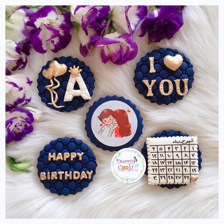 پک کوکی تولد تم سرمه ای طلایی 6 شامل 5 عدد کوکی همراه جعبه و ربان
