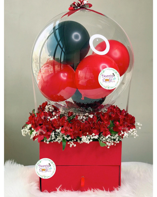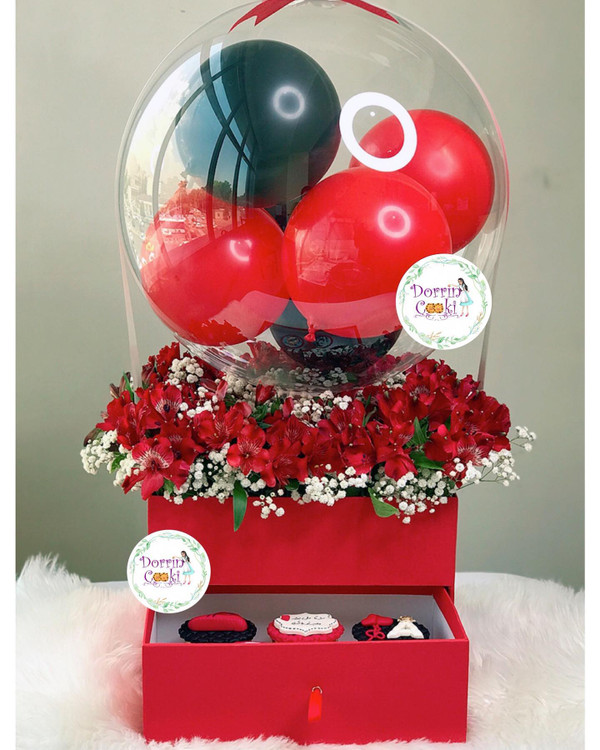 باکس گل و بادکنک وکاپ کیک سالگرد دوستی شامل باکس دوطبقه قرمز و گل و بادکنک مشکی و قرمز و کاپ کیک تولد شکلاتی