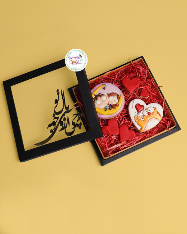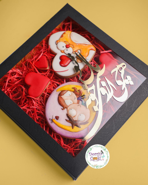باکس هرچی آرزوی خوبه مال تو همراه 2 عدد کوکی طرحدار سایز بزرگ و 4 عدد کوکی قلب متوسط و پوشال