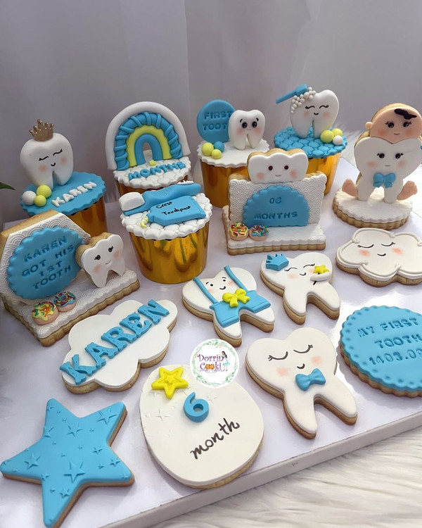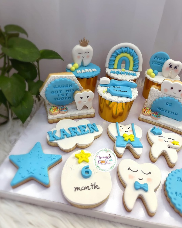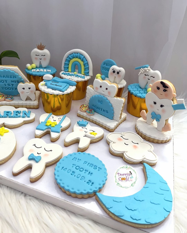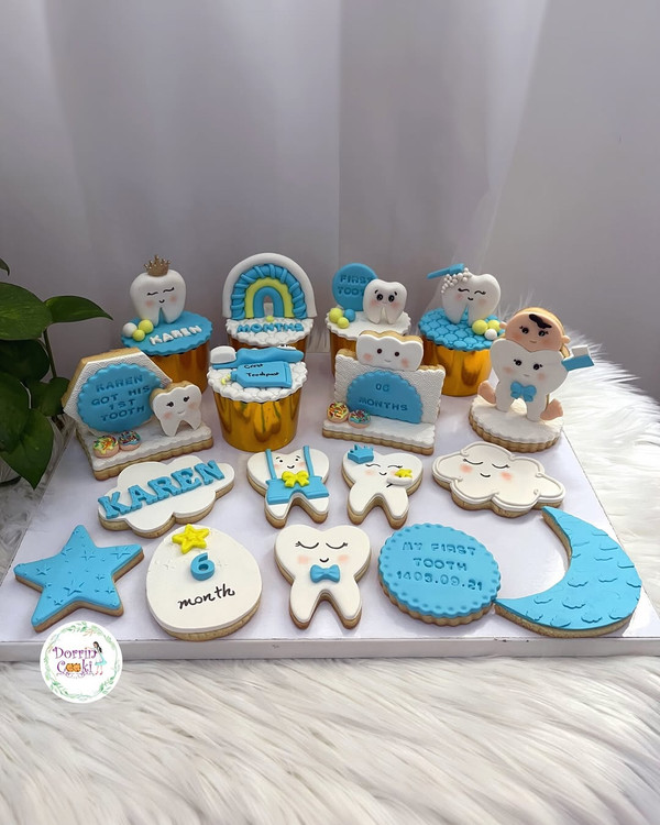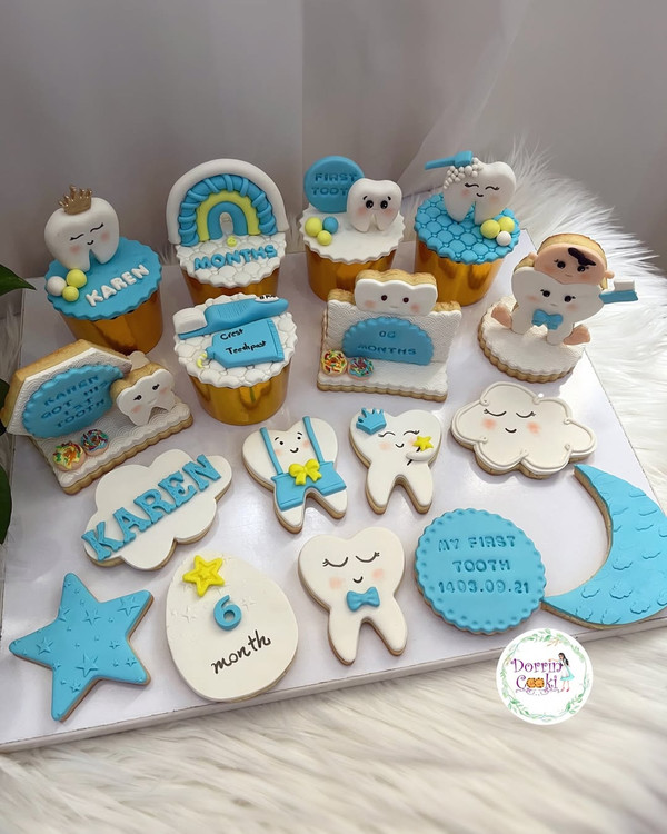 ست کامل کوکی و کاپ کیک دندونی برای اقا کارن گلمون این ست رو با هر تم رنگی که بخواین میتونین سفارش بدین. ست شامل ۵ عدد کاپ کیک ۳ عدد کوکی استندی و ۹ عدد کوکی میباشد