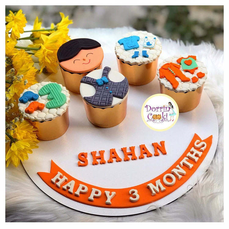 سینی کاپ کیک ماهگرد نوزاد پسر شامل 5 عدد کاپ کیک شکلاتی و سینی طرح اسم و ماهگرد