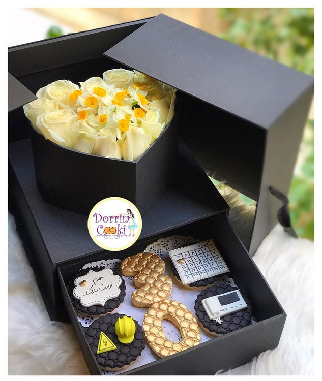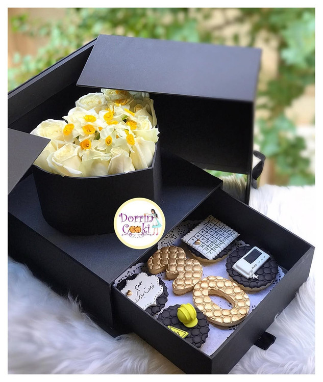 باکس سورپرایز گل و کوکی مهندس برق در فصل هایی که گل نرگس در بازار نیست در باکس بجاش گل رز همرنگ بقیه گل ها گذاشته میشه.