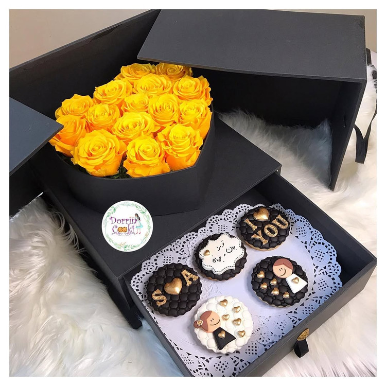 باکس سورپرایز گل رز زرد و کوکی سالگرد