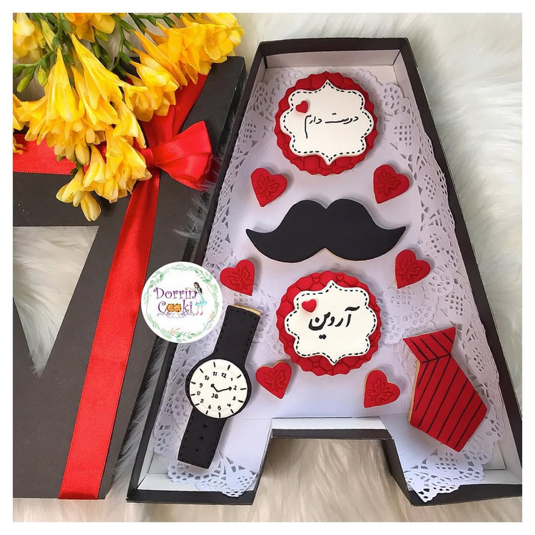 باکس حروف و کوکی روز مرد شامل جعبه حروف و 5 عدد کوکی تم مردانه این کار با جعبه ساده به قیمت 480 هم قابل سفارش است