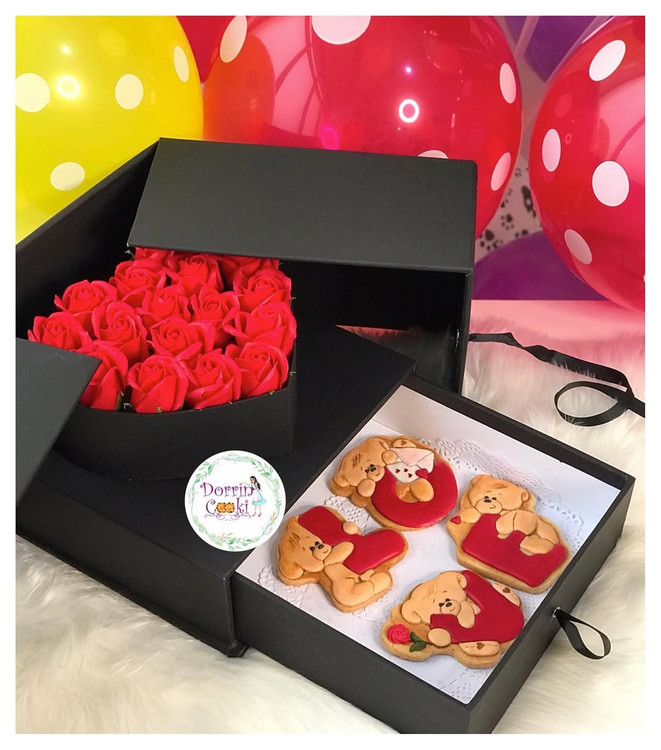 باکس سورپرایز گل و کوکی ولنتاین خرسی