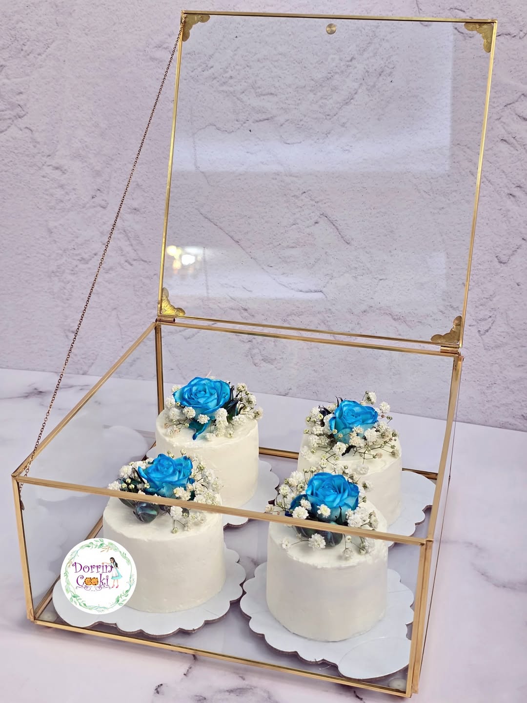 باکس مینی کیک که این روزا خیلی طرفدارش شدین با تعداد و رنگ گل مدنظرتون قابل سفارش هست همراه باکس شیشه ای دور طلایی