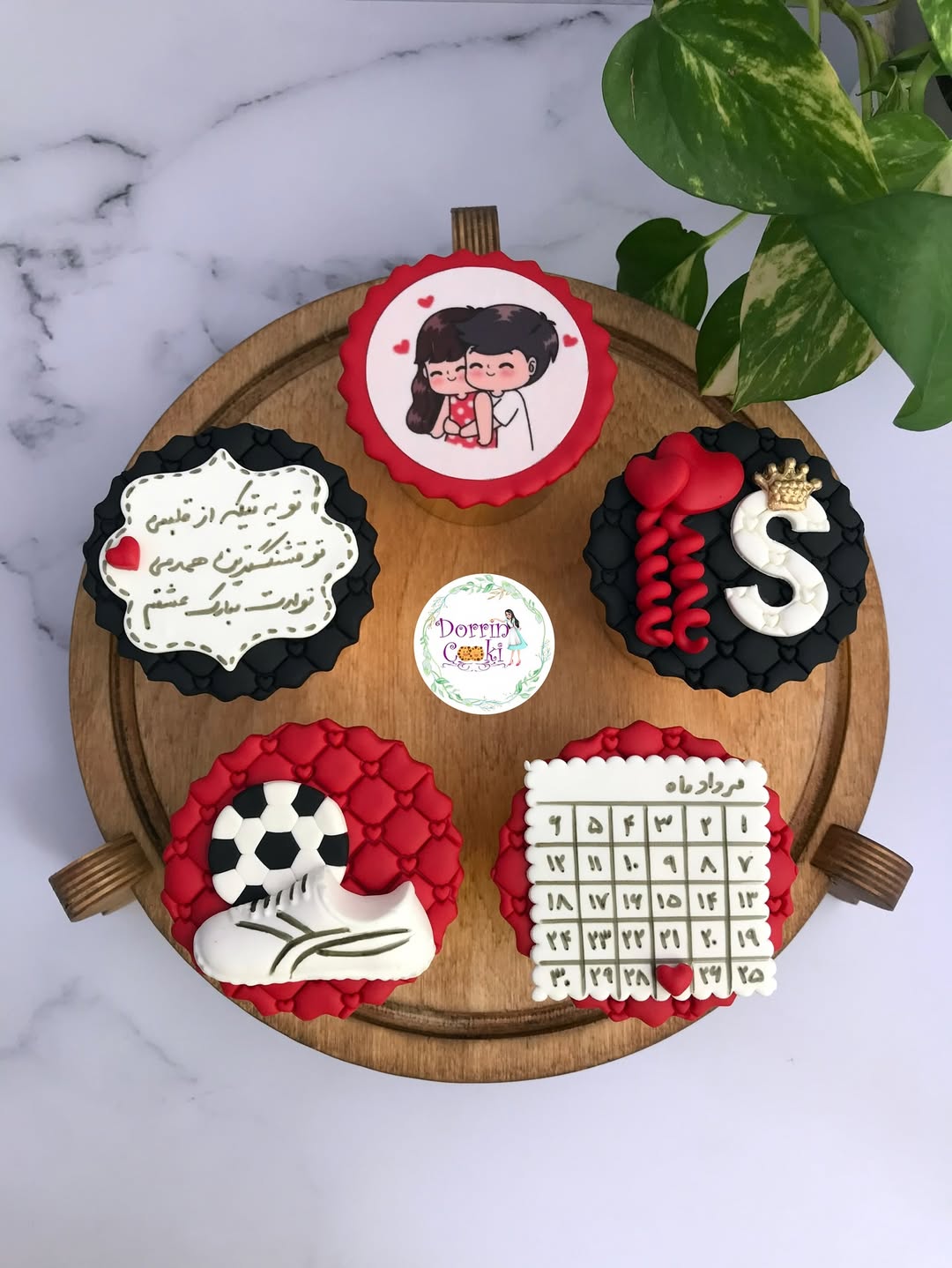 ست کاپ کیک تولد تم فوتبالی شامل ۵ عدد کاپ کیک شکلاتی تم فوتبالی مشکی و قرمز