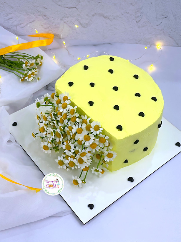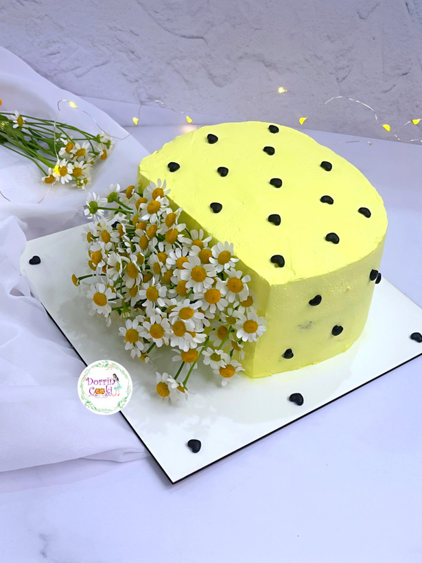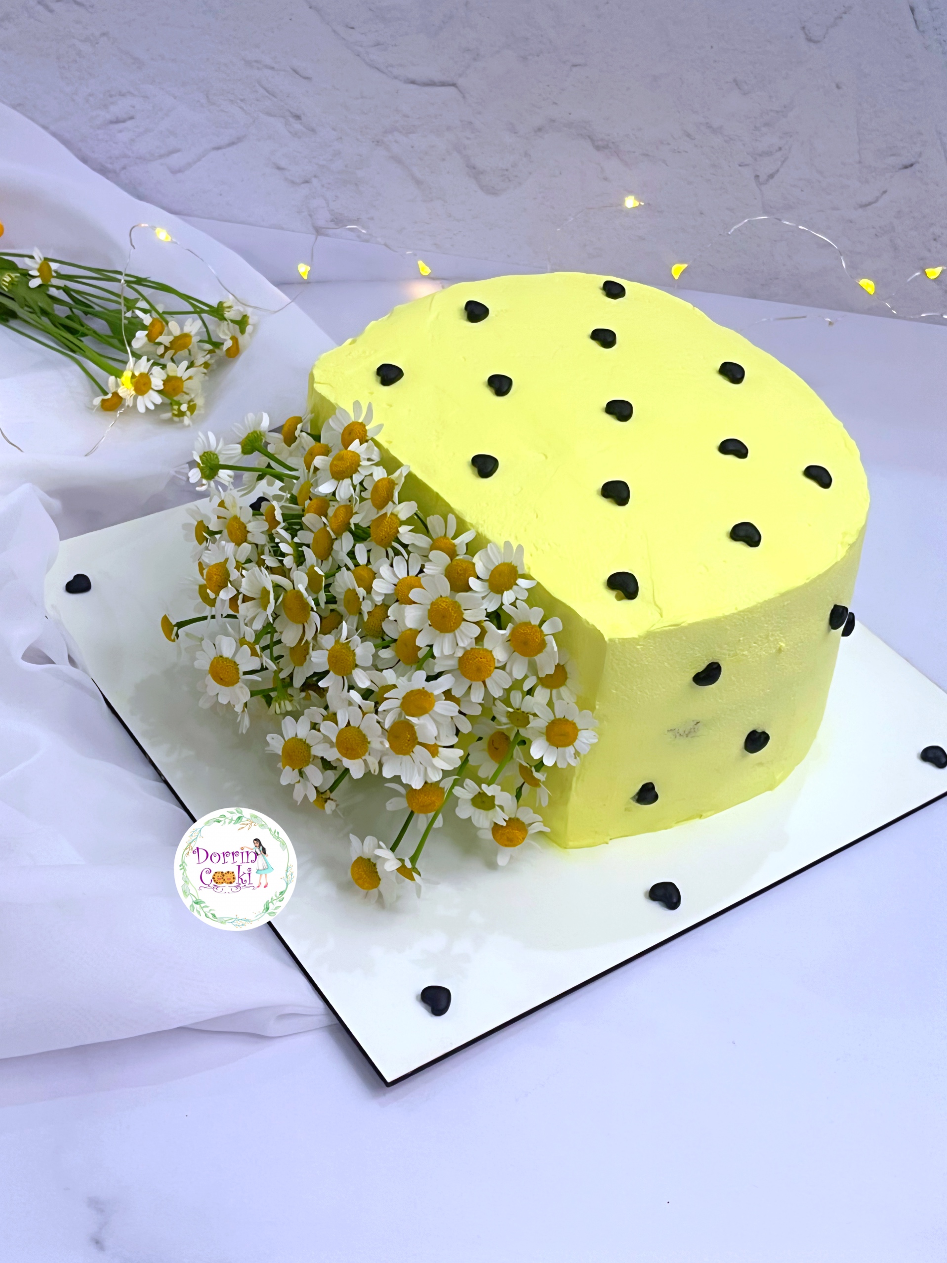 کیک خامه ای فیلینگ موز و گردو تازه مدل گلدان گل بابونه