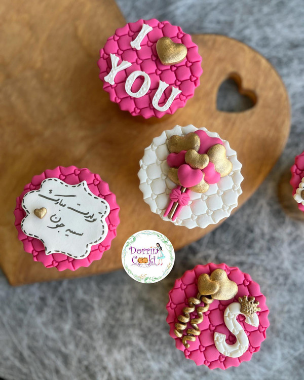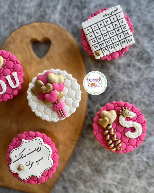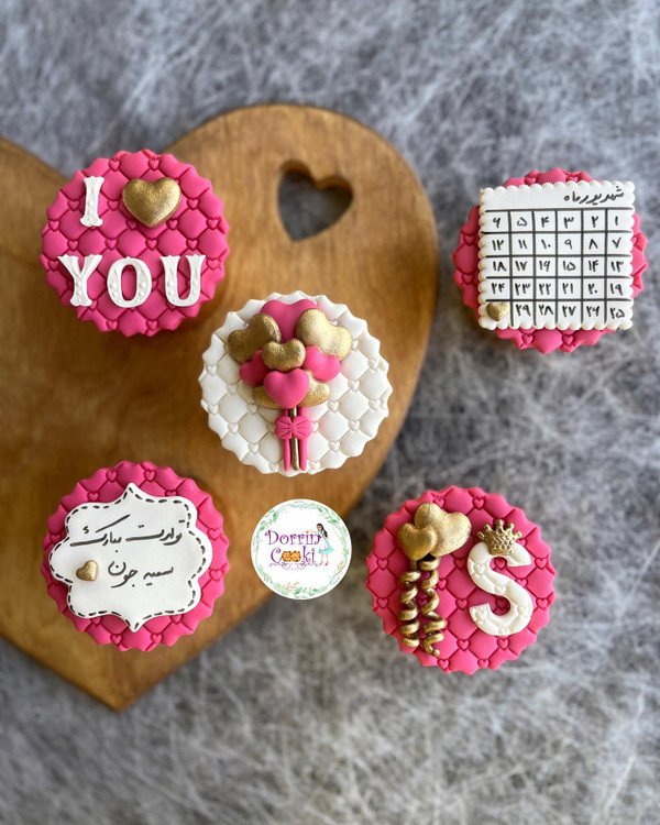 پک کاپ کیک تم صورتی سفید طلایی شامل 5 عدد کاپ کیک همراه جعبه ساده و ربان