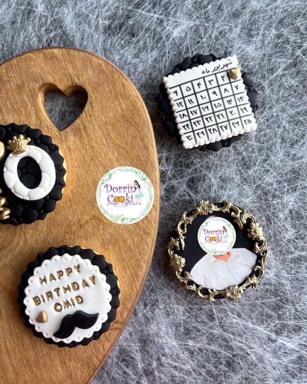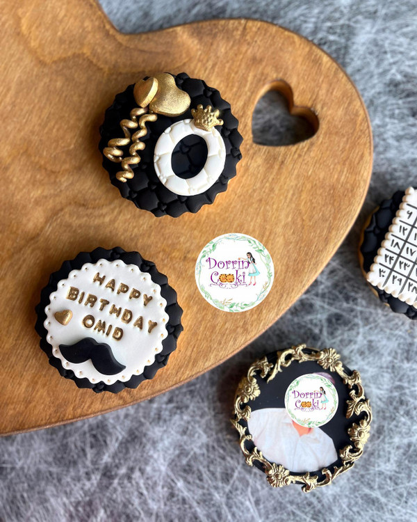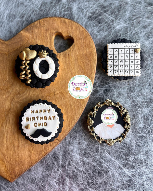 پک کوکی تولد مشکی طلایی شامل 4 عدد کوکی همراه جعبه و ربان