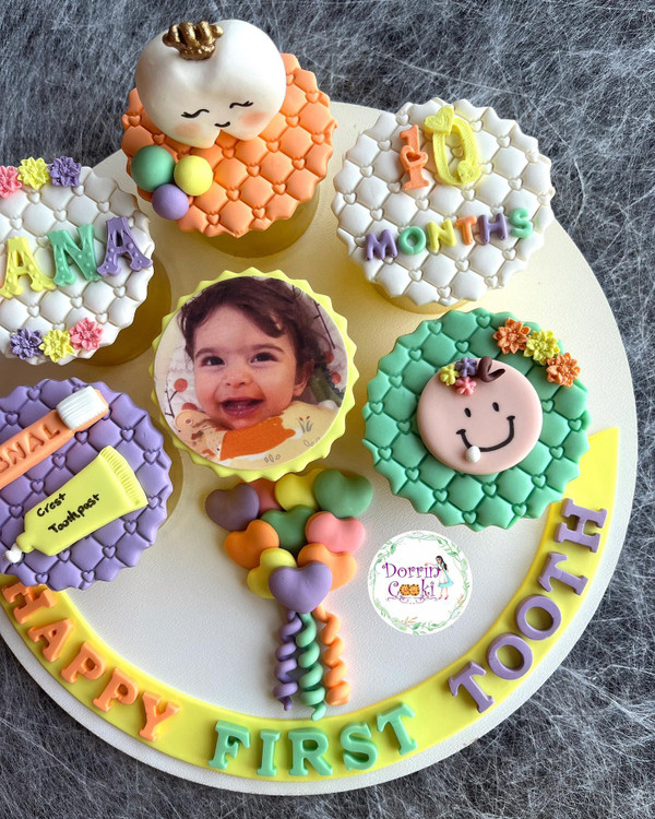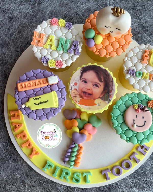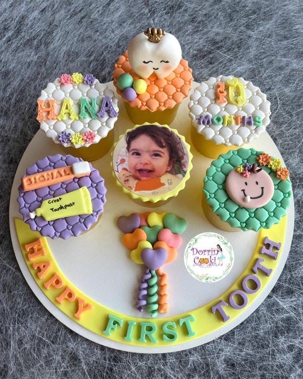 سینی کاپ کیک دندونی طرح رنگی شامل 6 عدد کاپ کیک طرح دندونی و سینی طرحدار