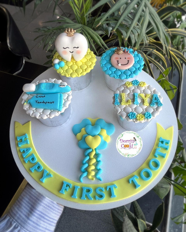 سسینی دندونی تم آبی و زرد شامل 4 عدد کاپ کیک و سینی طرحدار