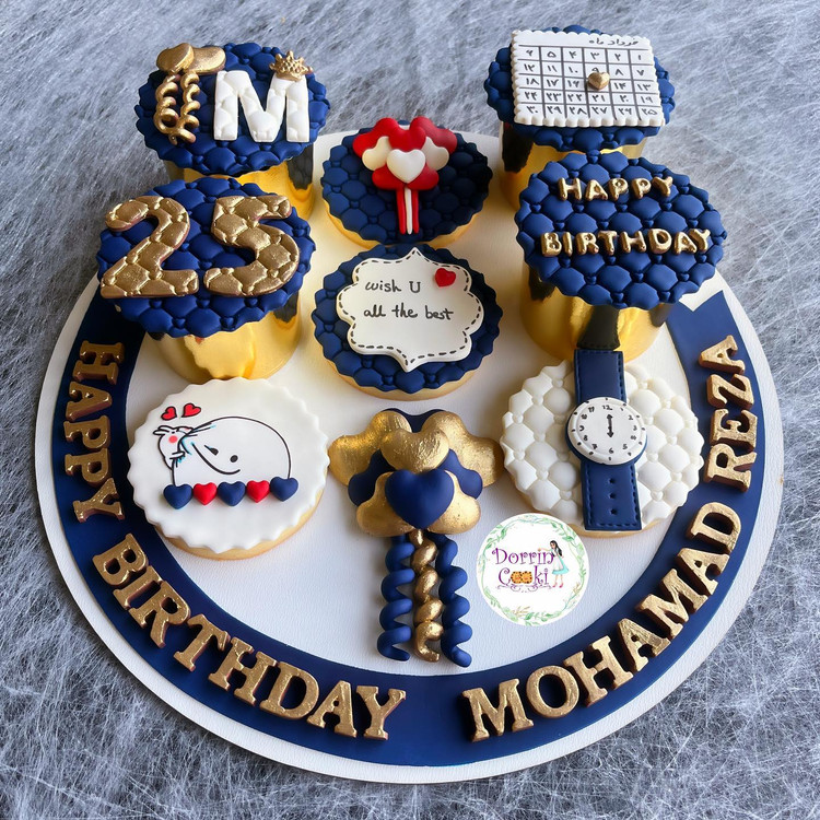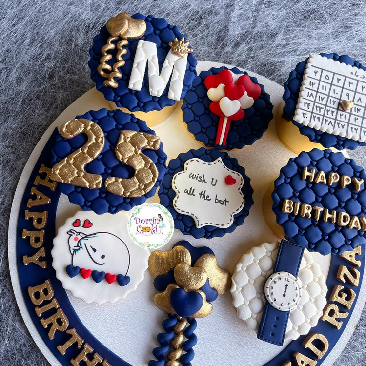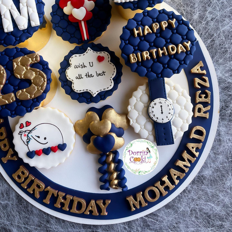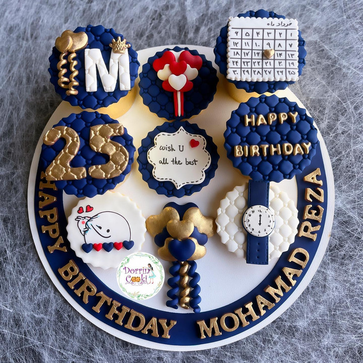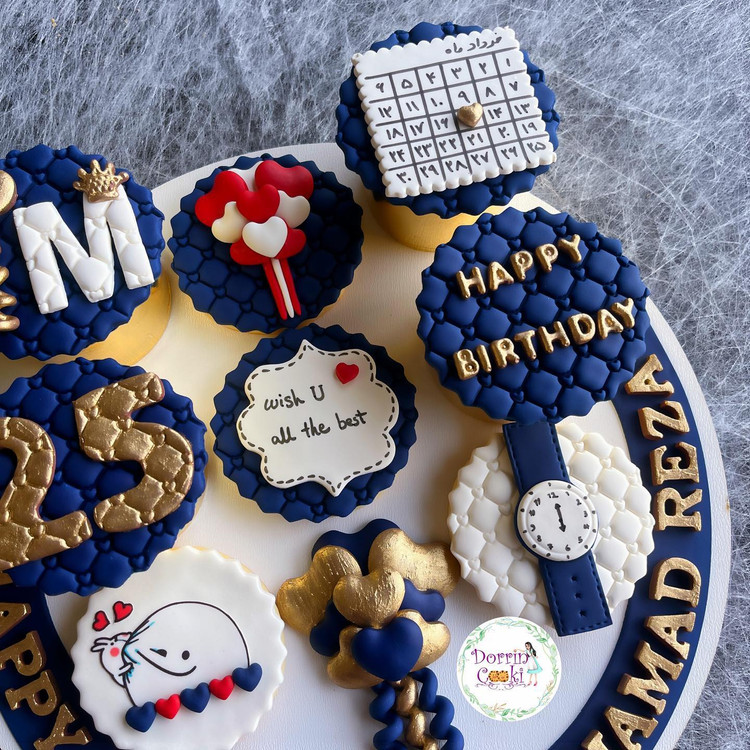 سینی کوکی و کاپ کیک تولد تم سرمه ای طلایی شامل 4 عدد کاپ کیک شکلاتی 4 عدد کوکی به همراه سینی طرحدار
