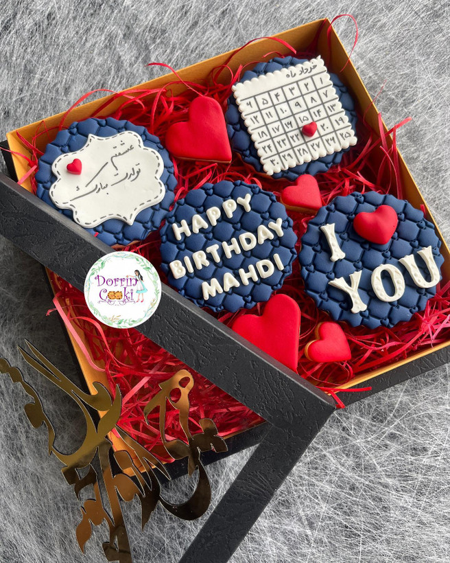 پک کوکی تولد تم سرمه ای سفید همراه جعبه خاص شامل 4 عدد کوکی تم تولد 4 عدد قلب متوسط وریز همراه پوشال و جعبه هرچی آرزوی خوبه مال تو