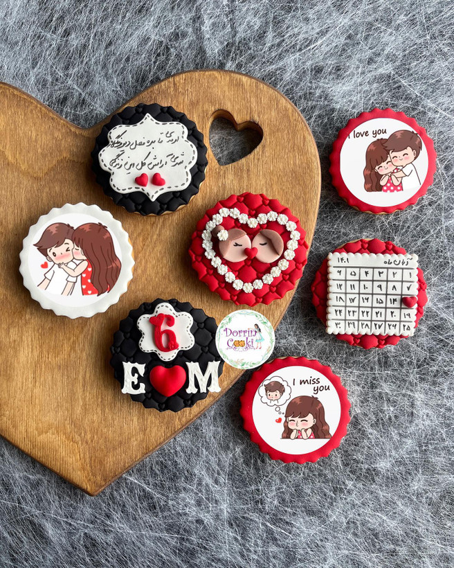 پک کوکی سالگرد ازدواج تم قرمز و مشکی شامل 7 عدد کوکی طرح سالگرد یا ماهگرد همراه جعبه و ربان