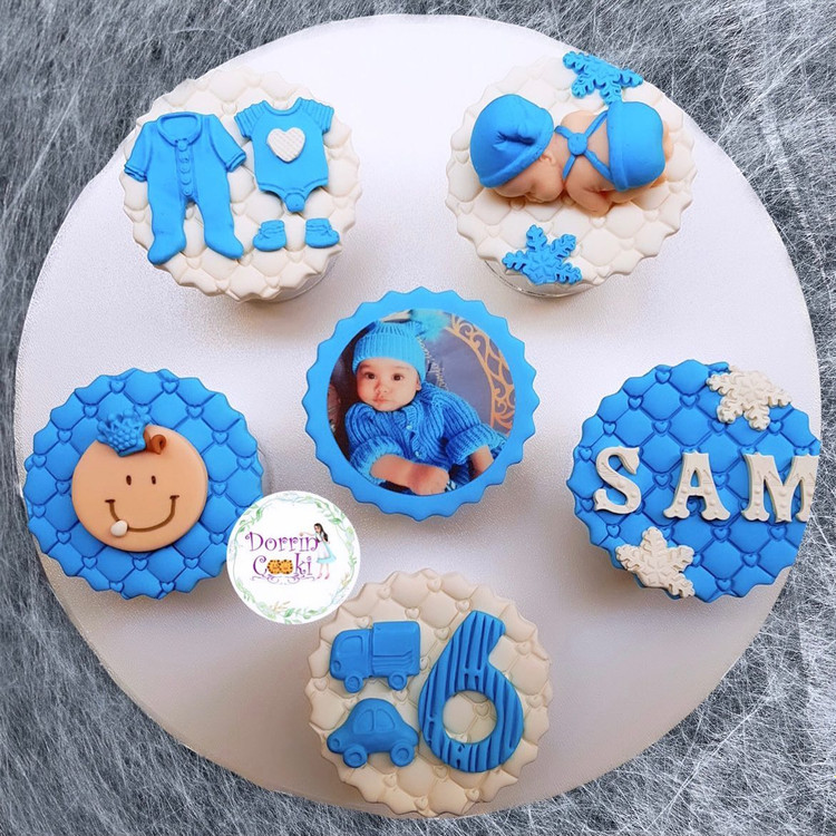 سینی کاپ کیک تولد نوزاد تم آبی شامل 6 عدد کاپ کیک شکلاتی همراه سینی