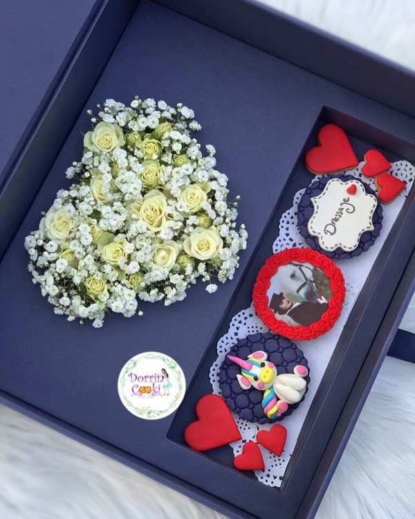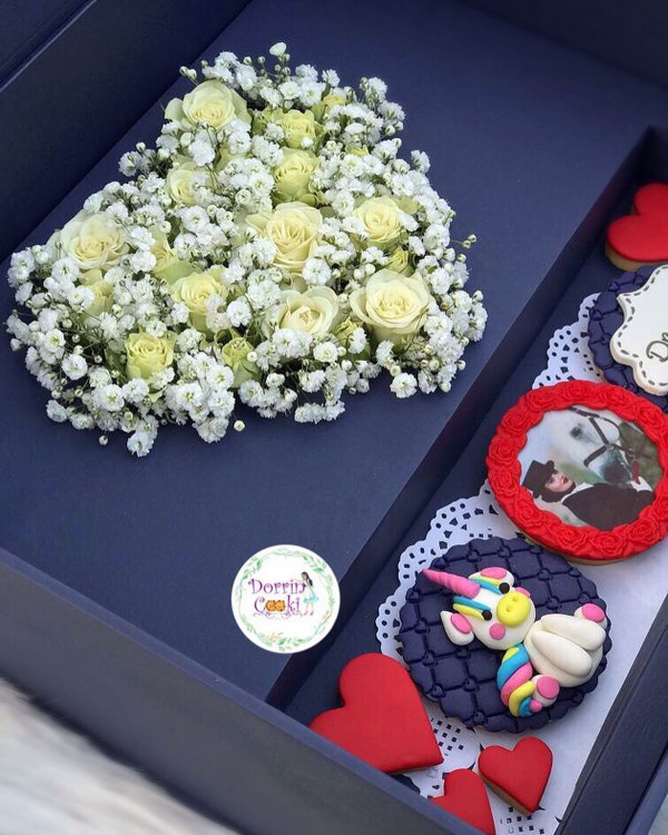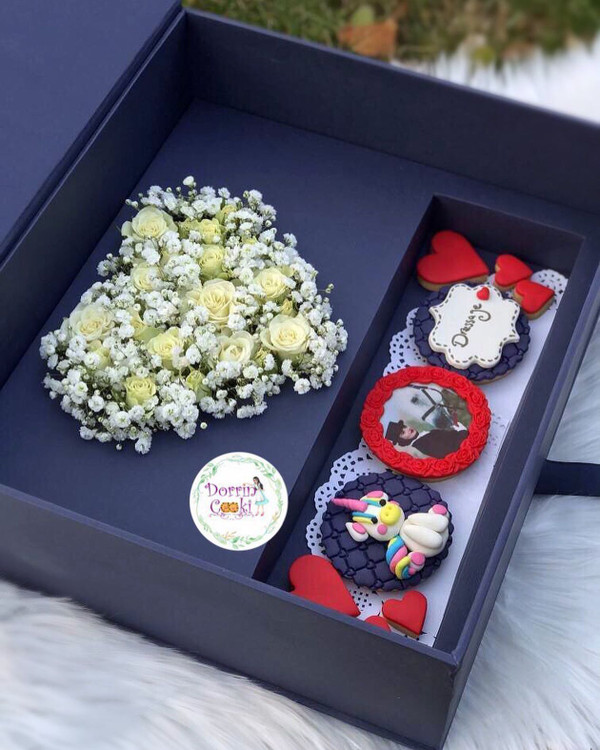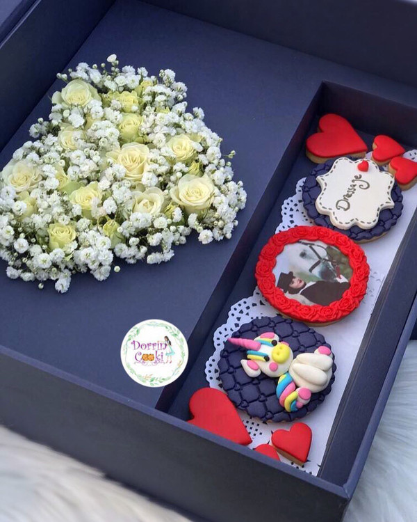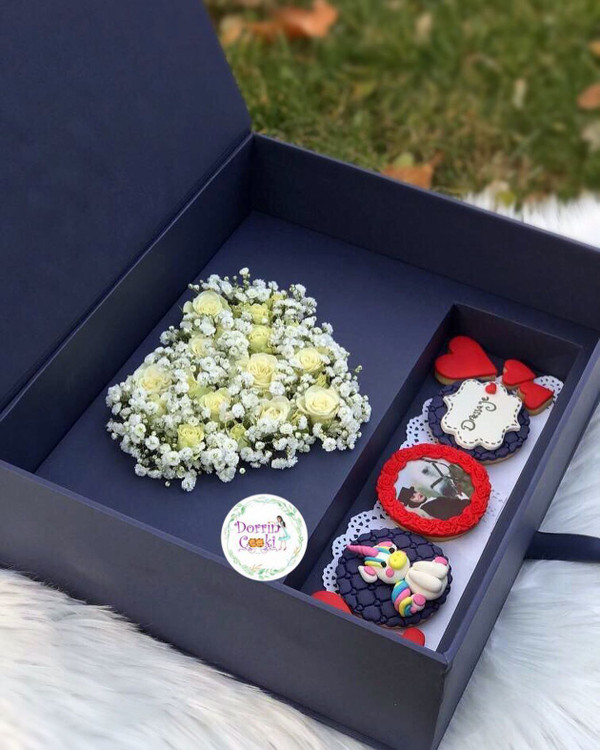 باکس سورپرایز لپتاپی سرمه ای همراه کوکی تم تولد شامل باکس و گل و 3 عدد کوکی تم تولد و 6 عدد کوکی متوسط و ریز