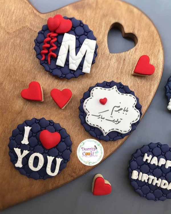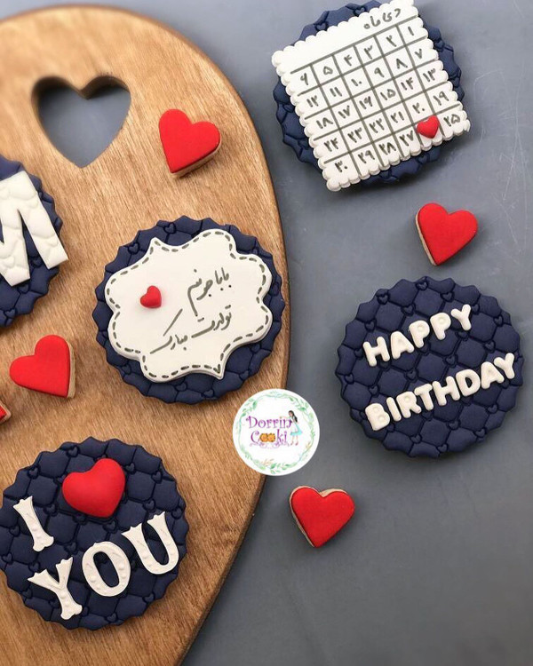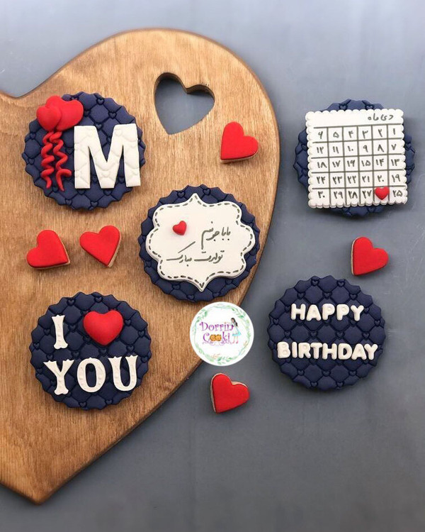 پک کوکی تولد تم سرمه ای قرمز شامل 5 عدد کوکی طرح تولد و 5 عدد کوکی قلب ریز و جعبه و ربان