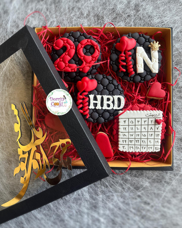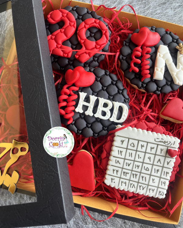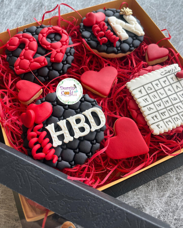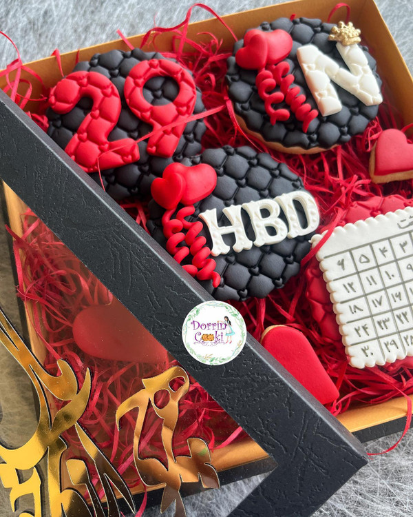 پک کوکی تولد تم مشکی و قرمز همراه جعبه خاص شامل 4 عدد کوکی تم تولد و 4 عدد کوکی قلب متوسط و ریز